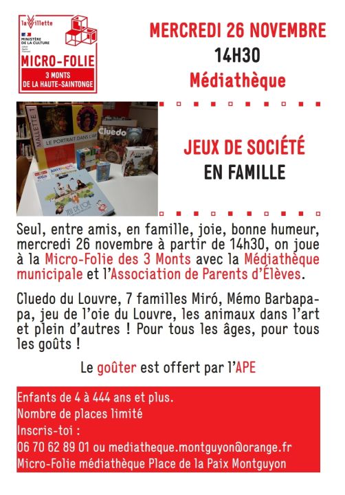 Voici deux activités organisées avec la médiathèque, la micro folie et le cinéma de Montguyon pour le mois de novembre. Si cela vous intéresse n'hésitez pas à vous y inscrire !!!! En espérant vous rencontrer lors de ses événements.
